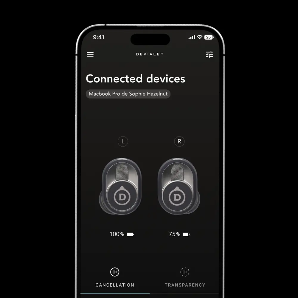 Công nghệ khử tiếng ồn thích ứng mới của Devialet tự động căn chỉnh theo hình dạng tai của bạn. Kết quả là: giảm thiểu tạp âm và tiếng ồn trắng, mang lại trải nghiệm nghe nhạc dễ chịu hơn mà không ảnh hưởng đến hiệu năng, đồng thời hạn chế lượng pin tiêu hao.